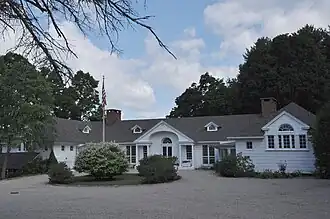 The clubhouse is a U-shaped wood frame structure with Georgian Revival design. The open mouth of the U faces south toward the main parking area, and its western facade looks over the golf course, with a band of windows providing a view. Two brick chimneys rise near the bends in the U. Small gabled dormers adorn the roof faces on the inside of the U. The main entrance is in the center of the U, sheltered by a projecting gabled portico, which is supported by round columns and has a segmented arch at its center. The ends of the U legs have gabled ends with Palladian windows. The clubhouse was built in 1915-17 to a design by Alfredo S.G. Taylor,[3] a New York City architect who summered in Norfolk, and is credited with more than thirty commissions in the community.[4]