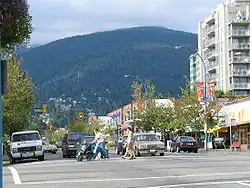 Main thoroughfare Lonsdale Avenue with Mount Fromme in the background