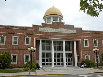 In 1883, the first school in Ocean City was built in 1883 between 8th and 9th Streets on Central Avenue, serving Kindergarten to High School. The first graduating class of six students was in 1904. A separate elementary school was built in 1913, causing the original Central Avenue to become the sole building for the high school. In 1923, a new high school was built between 5th and 6th Streets on Atlantic and Ocean Avenue, and the original facility became the city's police department and municipal court. The high school on Atlantic Avenue expanded in 1967, and again in 1983. By 1995, the Ocean City School Board decided that the 1923 facility was outdated and failed to meet state efficiency standards. After two failed referendums on expanding the school, a referendum in 2001 passed to build a new high school, having secured $11.5 million in state funding (equivalent to $20.4 million in 2024).[7][8][9] The new facility opened in 2004, and the original high school from 1923 was demolished in 2005 apart from the main entrance.[10] The main entrance of the original building can still be seen on Atlantic Avenue.