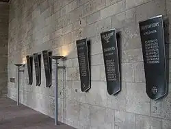 Also located there were the Langemarck-Halle (below) and the Bell Tower (rising high). The walls were built with sturdy stone from the area of the Lower Alps, and also feature equine sculptures (work of Josef Wackerle). This consisted of huge halls built under the stands of the Maifeld. Pillars were raised on which hung flags and shields commemorating all the forces that participated in a battle fought in Langemark (West Flanders, Belgium) on 10 November 1914, during the First World War. Since 2006, the ground floor is home to a public exhibit providing historical information on the area of the former Reichssportfeld.