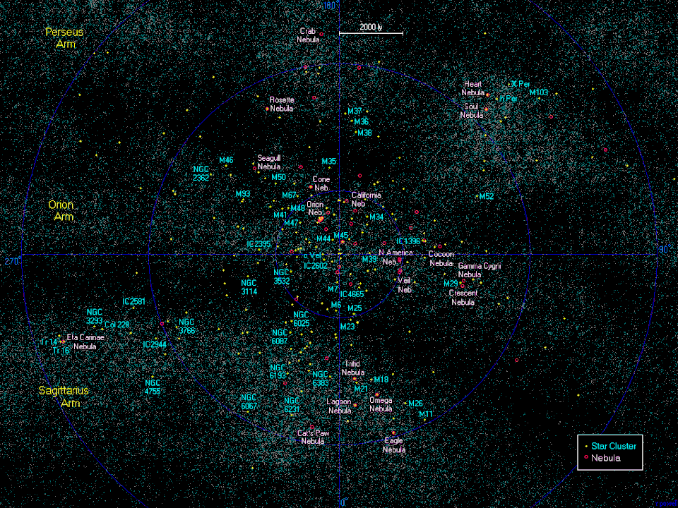 The Solar System is close to its inner rim, about halfway along the arm's length, in a relative cavity in the arm's interstellar medium, known as the Local Bubble. It is approximately 8,000 parsecs (26,000 light-years) from the Galactic Center.