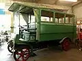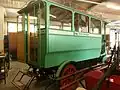 The Orion buses were built between 1899 and 1903 at the Orion factory at Zurich. They offered 12 seats for passengers. The entrance for the passenger compartment is at the rear. The vehicle is equipped with four solid rubber tires.