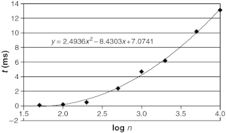 The graph shows the running time vs. problem size for a knapsack problem of a state-of-the-art, specialized algorithm. The quadratic fit suggests that the algorithmic complexity of the problem is O((log(n))2).[24]