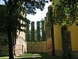 The main tourist destination is the complex of the former abbey. The abbey was founded in 1321. Today the main building of the abbey houses the municipal office. The main feature of the complex is the unfinished Church of the Virgin Mary, whose construction was interrupted by a fire in 1382. Next to the church is a Baroque bell tower dating from 1747. The area also includes a park. A castle used to be here, but it was demolished in 1971.[5][6]
