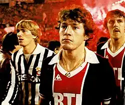 After a comfortable victory over Swansea City, a record 49,575 fans packed the Parc des Princes for their quarter-final clash with Waterschei.[5][6] PSG's 2–0 victory was well-earned, thanks to Fernandez's outstanding performance and opening goal. They could have scored more and would later regret it, losing the return leg 3–0 in extra time. PSG qualified for the 1983–84 UEFA Cup Winners' Cup after successfully defending their Coupe de France title.[6][7] Their first-round opponent were Glentoran, whom they beat 4–2 on aggregate to set up a tie against Michel Platini's Juventus.[6][8] PSG held their own, drawing both legs but bowing out due to the away goals rule against the eventual champions. They came very close to eliminating Juve in the second leg in Turin: a Sušić free kick hit the post and Pilorget missed a clear chance just before the final whistle.[6]