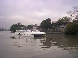 In 1990, Filipino shipping conglomerate Magsaysay Lines began operating Metro Ferry as an alternative mode of transport along the Pasig River to alleviate the traffic problem in Manila.[3] The Metro Ferry operated a route from Guadalupe in then-municipality of Makati down to Escolta Street in Manila, spanning a total length of 15 kilometers (9.3 mi) using river-side sheds as stations and piers constructed by the Philippine Ports Authority. The service, however, lasted only for a year, closing in 1991.[2] Its short-lived operation was beset by problems such as the proliferation of informal settlers along the route, water lilies, garbage and other debris clogging the waters. Aside from the foul odors permeating the environs, these problems also prevented the boats from traveling at normal speeds.