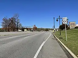In the 1960s, the Pennsylvania Department of Highways planned for an expressway just east of the PA 100 corridor that would run from the Pennsylvania Turnpike interchange in Uwchlan Township to US 202 near West Chester, though these plans were never fully realized.[28] However, in 1968, a 2-mile (3.2 km) long, four-lane freeway was built connecting PA 100 south of Exton to US 202 north of West Chester. The freeway was officially unsigned, but was colloquially referred to as the "PA 100 Spur" and was designated as State Route 2023 (SR 2023) when the Location Referencing System was established in 1987.[29][30][24][31] In the 1970s, PA 100 was widened into a divided highway between Exton and Lionville.[32]