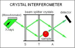 Crystal interferometry, sometimes also called X-ray interferometry, is the oldest but also the most complex method used for experimental realization. It consists of three beam splitters in Laue geometry aligned parallel to each other. (See figure to the right) The incident beam, which usually is collimated and filtered by a monochromator (Bragg crystal) before, is split at the first crystal (S) by Laue diffraction into two coherent beams, a reference beam which remains undisturbed and a beam passing through the sample. The second crystal (T) acts as a transmission mirror and causes the beams to converge one towards another. The two beams meet at the plane of the third crystal (A), which is sometimes called, the analyzer crystal, and create an interference pattern the form of which depends on the optical path difference between the two beams caused by the sample. This interference pattern is detected with an X-ray detector behind the analyzer crystal.[9][43]