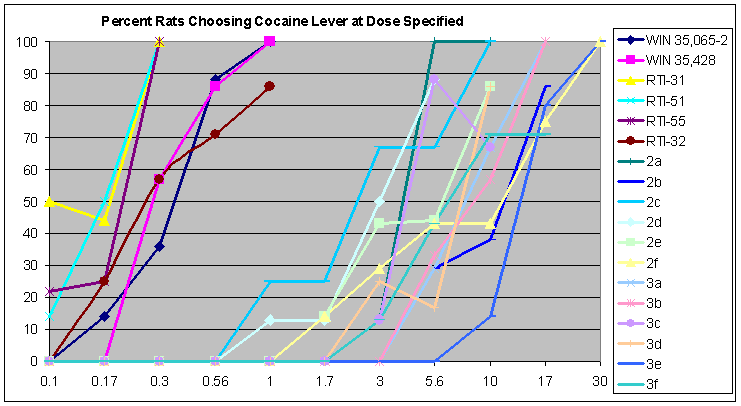 All of the tables and graphs shown beneath is from an article published by FIC, et al. 2004.[20] In summary the following observations can be made: Troparil, WIN35428 and RTI-32 are insufficiently potent. This observation is mainly based on the fact that at 100 mg/kg both troparil and WIN35428 produce convulsions. The twist-boat isomers are insufficiently potent in all cases. The trans isomers (alpha,beta) are too weak and might actually be dangerous and cause death. RTI-55, while highly potent, still causes death at a dose of 100 mg/kg. It is advised to consider RTI-229. RTI-31 is the most potent isomers for the DAT and was "safe" (on a relative scale) even in the event of overdose at 100 mg/kg. RTI-51 also looks like a "good" compound, although its synthesis is slightly more difficult than for RTI-31. RTI-51 is less selective for the DAT than RTI-31 and has appreciable SERT affinity also.