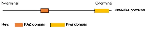 Presently there are four known human Piwi proteins—PIWI-like protein 1, PIWI-like protein 2, PIWI-like protein 3 and PIWI-like protein 4. Human Piwi proteins all contain two RNA binding domains, PAZ and Piwi. The four PIWI-like proteins have a spacious binding site within the PAZ domain which allows them to bind the bulky 2’-OCH3 at the 3’ end of piwi-interacting RNA.[11]