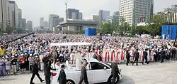 - Pope Francis arrived in Seoul Air Base on 14 August to start his five-day visit to South Korea on the occasion of the Sixth Asian Youth Day.[10] Upon arrival, Francis was greeted by South Korean President Park Geun-hye.[11] Afterwards, Francis held a private meeting with the families of victims of the MV Sewol ferry disaster.[12] He later made a speech in English, his first as Pope. Speaking at the Presidential Office in Seoul he said "I came here thinking of peace and reconciliation on the Korean Peninsula."[13] Francis held the first public Mass of his trip on 15 August in front of a 50,000 strong crowd at Daejeon World Cup Stadium where he asked Koreans to "reject inhumane economic models which create new forms of poverty and marginalize workers."[14] He beatified the first generation of 124 Korean Martyrs in Gwangwhamun Square on front of an estimated crowd of 800,000 people on 16 August.[15] Francis concluded his five-day visit with a Mass for peace and reconciliation of the divided Korean peninsula in Seoul's Myeongdong Cathedral.[16]