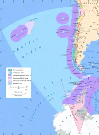 Chile created this theory, and was the first to implement one in 1991, with the passage of law N°19080.[6] Article 1, final paragraph, defines the concept of a "presential sea" for the southeastern quadrant of the Pacific Ocean: