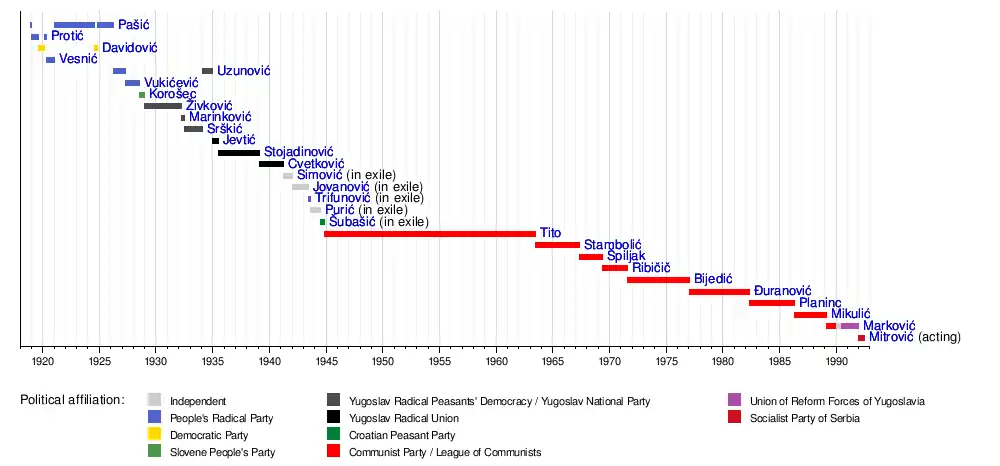 Aleksandar Mitrović (politician)Ante MarkovićBranko MikulićMilka PlanincVeselin ĐuranovićDžemal BijedićMitja RibičičMika ŠpiljakPetar StambolićJosip Broz TitoIvan ŠubašićBožidar PurićMiloš Trifunović (politician)Slobodan JovanovićDušan SimovićDragiša CvetkovićMilan StojadinovićBogoljub JevtićMilan SrškićVojislav MarinkovićPetar ŽivkovićAnton KorošecVelimir VukićevićNikola UzunovićMilenko Radomar VesnićLjubomir DavidovićStojan ProtićNikola Pašić
