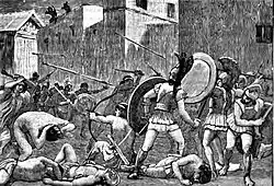 After receiving a favourable omen during the night Pyrrhus renewed his assault.[38] An effect of the shortage of warriors was that the Spartan women were active in providing the defenders with missiles and refreshments as well as taking away the wounded.[39] In an attempt to nullify the Spartans' advantage, the Epiriotes tried to fill up with trench with debris and bodies but were prevented from doing so by the Sparta. Responding to this Spartan counter-attack, Pyrrhus personally led a charge against the Spartan lines and succeeded in entering the city, spreading panic amongst the defenders.[38] However, at this point his horse threw him after it was wounded by a javelin in the belly.[39] Pyrrhus' fall threw his companions into a state of dismay, permitting the Spartans to rally and they managed to slay many of the companions in a barrage of missiles. Despite this, Pyrrhus was taken safely back to his camp.[39]