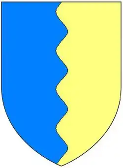 Arms of Poer (or Power) family of Hayes, East Budleigh (15th century), later quartered by Duke family of Otterton, as formerly visible on porch of Otterton Priory: Per pale wavy azure and or[6]