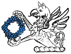 Crest of Duke: A demi-griffin salient argent, holding in its dexter claw a chaplet azure.[1] Depiction incised on monumental brass of Duke's great-nephew Richard III Duke (1567–1641), Otterton Church