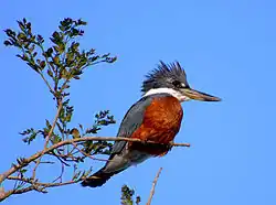 Ringed kingfishers are seen in freshwater habitats, tropical and temperate marine shorelines, and several islands, such as Coiba Island.[14] Breeding occurs in aquatic regions with the support of aquatic animals, including fish-populated areas for nesting burrows. Nests can be found farther away from water.[15] Habitats are near waterbodies that include streams, rivers, ponds, lakes, estuaries, and marine habitats. Habitats with clear water and less vegetation are preferred to easily access prey.[13]