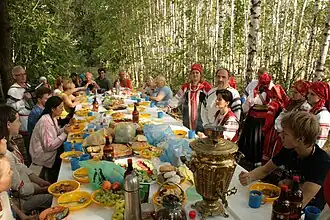 Ritual activities are often performed at major holidays throughout the year.[84] The calendar of an Anastasian community may be organised according to the cosmic days of the traditional Slavic calendar, or according to the needs of the given community itself.[84] The solstices and the equinoxes are celebrated by all Anastasians.[91] Some Anastasians even celebrate Christian holidays, chiefly Christmas, and secular national holidays.[84] Some holidays are distinctively Anastasian and taken from Megre's books, such as the celebration of the "Earth Day" on 23 July with rituals under the cedars.[92] Holidays and rituals are deemed important to maintain social order and stability, to connect with the cycle of time, to connect with the family and the ancestors, as well as for finding new friends and marriage partners among like-minded people.[93] Anastasians believe that the holy times are the best moment to gather like-minded people and to find whether people are suitable for each other or not, and they believe that this is a practice which goes back to the ancient "Golden Age".[93]