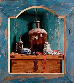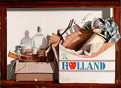 In 1981 he painted, for the first time, the same still life from three different angles, as well as the same still life from four angles (opposite sides). His goal was to enforce a more realistic view of the objects.[3] Henceforth Møhlmann consistently painted 1:1, i.e. the actual size of the object as seen. During the eighties the painter began a number of projects and series. One of them being the so-called Cantoproject (later called the Canto Collection), which could very well be considered his "magnum opus" and comprises the period 1982-1993. It has the subtitle "a glance at reality", and includes 124 paintings. All paintings have the same size and always show one and the same tin can (of the fictitious brand Canto) at the same place in the painting. Furthermore, the tin has always been depicted in the same size and is perceived at the same angle. Due to the constantly changing environment of the can, the series as a whole grew into a kind of pictorial adventure within the context of (seemingly) everyday reality. He also produced the series ‘Damaged’ or ‘Destroyed Canvasses’, in which the illusion is created that the canvas is torn or damaged.[4][5] During 1984 he worked on ‘The Cube’ (‘A Contemporary Allegory’) for almost nine months. The work consists of 5 panels that together form a cabinet in which and on which all kinds of everyday objects are painted, often with a symbolic meaning.[6] In 1985 the painter started with ‘The Balance Series’, in which he placed a still life on an empty canvas. Initially this was a single object, but over time increasingly complex stackings emerged.[7]