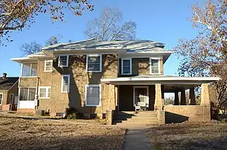 The Robert Atlas Harper House is a historic house at 201 North Main Street in Greenwood, Arkansas. Built about 1915, the house is a little-altered American Foursquare with a distinctive exterior made of a rough stone aggregate mixed with cement, creating a tabby-like rough stucco finish. Its front porch is also uniquely designed, with tapered square piers out of battered stone set atop a half-wall of the same material. The house was built by W. Calvin Stanfill, a local contractor who specialized in stone-masonry work.[2]