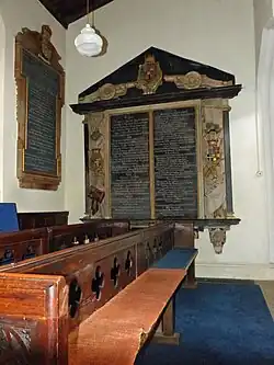 Toward midnight the Earl's old comrade Essex had news of his condition, and sent some officers to enquire for him, and promise speedy surgical attendance. Lindsey was still full of spirit, and spoke to them so strongly of their broken faith, and of the sin of disloyalty and rebellion, that they slunk away one by one out of the hut, and dissuaded Essex from coming himself to see his old friend, as he had intended. The surgeon, however, arrived, but too late, Lindsey was already so much exhausted by cold and loss of blood, that he died early in the morning of 24 October 1642, as he was being carried through the gates of Warwick Castle where other Royalist prisoners were being kept. His son, despite King Charles' best efforts to obtain his exchange, remained a prisoner of the Parliamentary side for about a year.[8] Lindsey is buried in St Michael and All Angels Church, Edenham, Lincolnshire.[1]