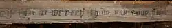 Drummond's own house at Carnock in Stirlingshire was demolished in 1941. It was abandoned and unsafe due to subsidence caused by essential coalworking during the 1914-18 war. It had an interesting plan with two staircases. The armorial panel of 1548 with his coat of arms and that of Marjorie Elphinstone can be seen at Sissinghurst Castle Garden. Painted ceiling boards and the front door of the house are displayed at Stirling Smith Museum and Art Gallery.[23] The oak beams from the ceiling, retained by Historic Environment Scotland have been dated to 1589 and carry inscriptions exhorting moral precepts, some from the Bible, some from the Stoic philosopher Gaius Musonius Rufus, perhaps following the English author William Baldwin although using Scottish spellings. Two now incomplete lines are: "Gif that in werteu thow takis ony paine ..." and "Naikit I cam into the warld ..."[24] The use of the first of these mottoes reflects the schoolroom of James VI at Stirling Castle, where he penned a Latin version into a catalogue of his library compiled by his tutor Peter Young. Mary I of England wrote an English version in her Book of Hours.[25] Historic Environment Scotland also has some plasterwork from a later ceiling from the house including the Nova Scotia arms of Nicolson of Carnock.