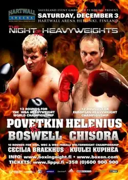 Robert Helenius vs. Derek Chisora, billed as The Night of the Heavyweights, was a professional boxing match contested between WBA and WBO Inter-Continental heavyweight champion, Robert Helenius, and Derek Chisora, with the vacant European heavyweight title also on the line. The bout took place on 3 December 2011 at the Hartwall Arena, with Helenius winning by split decision.