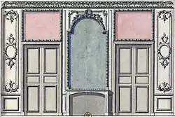 From newly-Bourbon Spain, the princesse des Ursins required his advice on the remodeling of her Château de Chanteloup near Amboise (Neuman, p. 229, note 4) and the queen's apartments of the royal palace in Madrid. An octagonal room was fabricated in Paris under de Cotte's eye, 1713–1715, and sent to be installed in Madrid. At La Granja, an assistant from de Cotte's office, René Carlier, was employed in the designs for the parterres.[17] For the cardinal de Rohan, de Cotte provided decors for the Château de Saverne in Alsace (1721–1722; destroyed by fire).