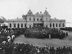In 1896 the All-Russian Exhibition was held in Nizhny Novgorod. After the exhibition, a branch of the Technical Society was established in the city, which began to address the issue of connecting the city by rail. The company developed a project for the Nizhny Novgorod - Kazan railway. In order not to build a bridge across the Oka, it was decided to run the railroad tracks along the coastal terrace. The location for the station was chosen on the right bank of the Oka, near the pier of the Bashkirov flour mills. Also, the station was located across the Oka opposite the already existing Moskovsky railway station. The construction started in 1900 was completed in 1904. The construction was carried out by the Society of the Moscow-Kazan Railway. The construction was supervised by Grigory Budagov.[1] The view of the railway station was captured by the photographer of the Russian Empire, Maxim Dmitriev.
