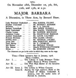 Major Barbara is a play by George Bernard Shaw in which the title character, an officer in the Salvation Army, grapples with the moral dilemma of whether this Christian denomination should accept donations from her father, who is an armaments manufacturer.[71]