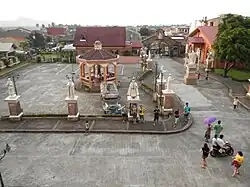 The grounds outside the church have been developed to promote Christian teachings for pilgrims. At the middle of the patio is a white statue of the Sacred Heart of Jesus. On both sides are several elevated white statues of different saints patron of each barangay in the town. The church patio was named, Patio de Sagrada Familia.[5][6]