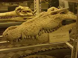 Saltwater crocodile skull from The Museum of Zoology, Saint Petersburg. Note the considerably more slender skull of a gharial in the background.