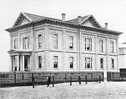 San Diego County was one of the original counties formed when California gained statehood in 1850. The first elected officers of the San Diego Court of Sessions met in October 1850, including presiding judge Hon. John Hayes and associate judges Charles Haraszthy and William H. Moon; the First Court House, approximately at the intersection of San Diego and Mason Streets, was part of what is now Old Town San Diego. County offices were moved to the Whaley House in 1869, and the original Court House was destroyed in the fire of 1872.[2] The 1872 fire originated in the old Court House.[3]