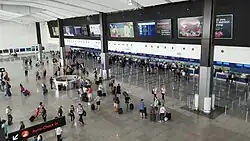 Terminal 2 is a two-story structure. The ground floor manages arrivals with customs and immigration facilities, a baggage claim area, car rental services, taxi stands, snack bars, and souvenir shops. The upper floor is dedicated to departures, featuring check-in areas, a security checkpoint, and a 400 metres (1,300 ft) long departure concourse. This section includes restaurants, food stands, duty-free shops, and 19 gates, nine of which are equipped with jet bridges. A VIP lounge in Terminal 2 is located past security, near the central food court.