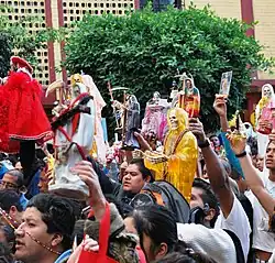 On the first day of every month Enriqueta Romero or one of her assistants lead prayers and the recitation of the Santa Muerte rosary, which lasts for about an hour and is based on the Catholic rosary.[12][36] On the first of November the anniversary of the Tepito Santa Muerte shrine erected by Enriqueta Romero is celebrated. This Santa Muerte is dressed as a bride and wears hundreds of pieces of gold jewelry given by the faithful to show gratitude for miracles granted, or to ask for one.[27]