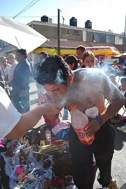 Rituals dedicated to Santa Muerte include processions and prayers with the aim of having a miracle granted.[12] Some believers of Santa Muerte remain members of the Catholic Church,[21] while others are cutting ties with the Catholic Church and founding independent Santa Muerte churches and temples.[40] Santa Muerte altars generally contain one or multiple images of the saint, generally surrounded by any or all of the following: cigarettes, flowers, fruit, incense, water, alcoholic beverages, coins, candies and candles.[22][12] Tobacco is also used for personal cleansing and for cleansing statues of Santa Muerte.