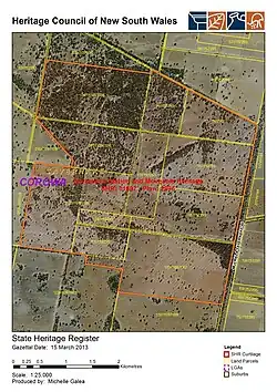 1876 - Selector's Hut: is an example of wattle and daub pioneering architecture, with the use of interlinked horizontal cypress pine logs, the gaps being filled with mud. Considered significant.[1]