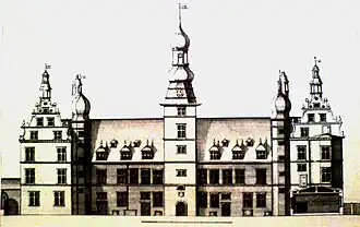 When Husum Castle was completed in the 16th century, the shorter side wings were originally one floor higher than the long central building. The gables of these wings were embellished with ornate and decorative sweeping tail work, similar to what can still be seen on the gatehouse. Due to the higher side wings and a taller roof structure, the castle had different proportions than it does today. Two slender towers with onion-shaped domes were inserted into the angles between the central wing and the shorter side buildings—like a tower found in the southern courtyard corner of Reinbek Castle—and several turrets sat on the high roof ridge.[16] The symmetrical division of the building followed a concept: the long central wing originally housed the grand halls of the castle and was accessed through the central staircase tower, while the northern wing served the duchess and the southern wing served the duke. Both side wings had their own spiral staircases leading to the residential apartments, located at the corners of the courtyard. Until the mid-18th century, it resembled other Nordic Renaissance castles like Rosenborg or Frederiksborg with its multi-towered silhouette.[17]