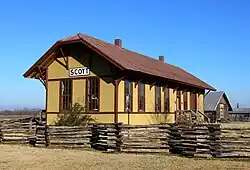 - Immediately northeast of Scott Charter School on the Pulaski County side is the Scott Plantation Settlement, a grouping of relocated buildings including the wooden Cotton Belt Railroad Depot that served Scott, collected to represent the area's plantation-era heritage (much in the same fashion as Little Rock's Historic Arkansas Museum).