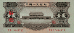 The second series of Renminbi banknotes was introduced on March 1, 1955 (but dated 1953). Together with the introduction of the second series, the decimal point was moved 4 places to the left. As a result, one first series ¥10,000 note is equivalent to one second series ¥1 note.