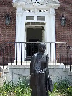 In front of the Sharon Public Library stands a statue of Deborah Sampson, Sharon's town heroine. Sampson disguised herself as a man to fight in the Revolutionary War. After the war, she married Benjamin Gannett, a farmer, and lived in Sharon until the end of her life. Sampson began a campaign in 1790 to secure a pension from her time in the Revolutionary War, which earned the support of well known public figures, including Paul Revere. In 1804, Revere visited Sampson (then Sampson Gannett) at her farm in Sharon and wrote to the congressman of her district, William Eustis, that he found her "much more deserving than hundreds to whom Congress have been generous."[4] Sampson was placed on the United States pension list a year later, and awarded an annual payment. She is buried in the local Rock Ridge Cemetery. A street in Sharon is named Deborah Sampson Street in her honor. In 1983, the Massachusetts General Court designated Sampson as the official State Heroine of the Commonwealth of Massachusetts.[5]