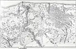 Württemberg reached Kolberg on 4 July, and he commanded a reinforced defense force of 12,000 troops. Russian commander Lieutenant General Pyotr Alexandrovich Rumyantsev-Zadunaisky, commanding a weaker force, took quarter in nearby Köslin (now Koszalin) on 23 June, awaiting reinforcements.[12] Lieutenant Colonel Ivan Ivanovich Möller-Sakomelsky was commander of the artillery under Rumyantsev, and was later entrusted with organizing and commanding one of the army's first light infantry units.[15] Vice Admiral Andrey Ivanovich Polyansky's squadron carried out the blockade from the sea. It included 24 ships, 1,300 guns and 7,000 marines. There was also allied with Russia a Swedish detachment of 9 ships and 438 guns.[8] Württemberg's plan to attack Rumyantsev as long as the odds favoured Prussia was cancelled by Frederick as too risky. After 3,000 Russian troops had reinforced Rumyantsev in mid-August, he laid siege to Kolberg on 22 August.[12]