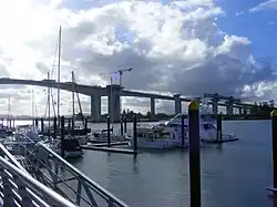 The Sir Leo Hielscher Bridges, formerly and still collectively referred to as the Gateway Bridge, are a pair of twin road bridges that carry the Gateway Motorway (M1) over the Brisbane River, skirting the eastern suburbs of the city of Brisbane. The western bridge carries traffic to the north and the eastern bridge carries traffic to the south. They are the most eastern crossings of the Brisbane River and the closest to Moreton Bay, crossing at the Quarries Reach and linking the suburbs of Eagle Farm and Murarrie. The original western bridge (formerly named the Gateway Bridge) was opened on 11 January 1986 and cost A$92 million to build.[1][3] The duplicate bridge was opened in May 2010, and cost $350 million.[1]