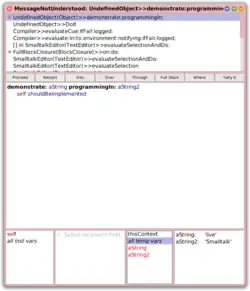 The default response to an unhandled exception is to open a Notifier, which is a window containing a stack backtrace of the first few activations, and buttons such as "Debug", "Proceed", "Close", etc. If the programmer chooses "Debug" then the full debugger opens. This has six panes. At the top is the stack window, containing a list of the contexts in the stack. Selecting a context causes the middle pane to display the text of the context's method, and to highlight the current expression within the method. Selecting the top context will display the method raising the exception and the message raising the exception will be highlighted. Selecting a context causes the bottom four panes to be updated. The bottom left two panes are the receiver inspector, that inspect the receiver of the selected message. The bottom right two panes are the context inspector that show the argument and temporary variable names in the selected context and allow display and modification of these variables.