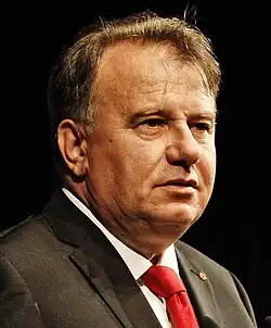 The Social Democratic Party of Bosnia and Herzegovina (Bosnian: Socijaldemokratska partija Bosne i Hercegovine, abbr. SDP BiH[5]) is a social democratic[6] political party in Bosnia and Herzegovina. It is considered the successor of the League of Communists of Bosnia and Herzegovina, the Bosnian branch of the former League of Communists of Yugoslavia.[7] Initially established as a multi-ethnic party, the SDP BiH has since the early 2000s experienced a decline in support among Croats and Serbs, and its voter base has become predominantly Bosniak.[8]