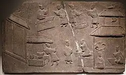 Certain occupations were traditionally reserved for women, while they were also exempted from corvée labor duties.[167] Women were expected to rear children, weave clothes for the family, and perform domestic duties such as cooking; although farming was considered men's work, sometimes women tilled fields alongside their husbands and brothers.[168] Some women formed communal spinning and weaving groups to pool resources together to pay for candles, lamp oil, and heat during night and winter.[169] A successful textile business could employ hundreds of women.[73] Singing and dancing to entertain wealthy patrons were other common professions open for women.[170] When a husband died, sometimes the widow became the sole supporter of her children, and thus had to make a living weaving silk cloths or making straw sandals to sell in the market.[171] Some women also turned to the humble profession of sorcery for income.[172] Other more fortunate women could become renowned medical physicians who provided services to the families of high officials and nobility.[173] Some wealthy women engaged in luxury trade, such as one who frequently sold pearls to a princess.[174] Some even aided in their husband's business decisions.[175] Female merchants dressed in silk clothes which rivaled even female nobles' attire were considered immoral compared to the ideal woman weaver.[175]