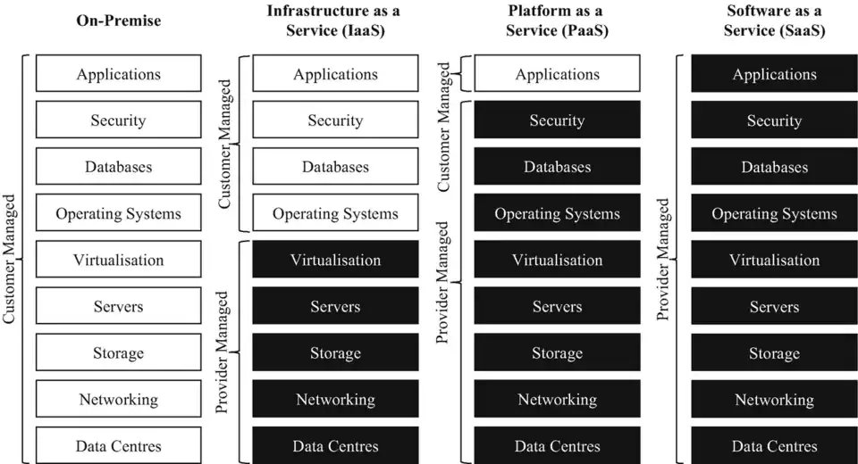 Comparison of on-premise hardware and software, infrastructure as a service (IaaS), platform as a service (PaaS), and software as a service (SaaS)