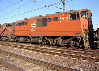 During 1990 and 1991, Spoornet semi-permanently coupled several pairs of otherwise largely unmodified Class 6E1 units, reclassified them to Class 16E and allocated a single locomotive number to each pair, with the individual units in the pairs inscribed "A" or "B". The aim was to accomplish savings on cab maintenance by coupling the units at their no. 1 ends, abandoning the no. 1 end cabs in terms of maintenance and using only the no. 2 end cabs. Most pairs were later either disbanded with the units reverting to Class 6E1 and regaining their original numbers or getting rebuilt to Class 18E.[6]