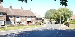 Crawley was connected to the railway network in 1848 when a line was built from Three Bridges to Horsham.[14] It crossed the High Street at a level crossing at the south end of the built-up area.[12] The provision of fast, regular trains to London and other destinations stimulated residential and commercial development, especially around the station.[14] South of the line, around the Brighton Road, there was plenty of land for building; in the second half of the 19th century, two building firms—the most important in Crawley's pre-New Town history—exploited it by building two areas of housing which still exist today, forming the northernmost part of the Southgate neighbourhood.[15][16] Richard Cook set up a building firm next to the railway line soon after its completion; in the early 1870s he built some streets of mainly terraced houses west of Brighton Road. Confusingly in the context of Crawley's later history, this area was called "New Town",[17] a name which persisted for many years; it had no connection with the later establishment of the New Town of Crawley under the New Towns Act 1946, the name being merely a coincidence. Based around Springfield Road and West Street, at the junction of which was Cook's yard, the "New Town" area had 43 houses in 1875.[12][18] In the early 1880s, James Longley established his building company nearby, which by 1909 had built an estate of houses east of the Brighton Road. The roads East Park and Malthouse Road had a mixture of terraced cottages, semi-detached houses, detached houses and large villas, all built from red brick.[12][19] Large houses were also built down both sides of the Brighton Road. Goffs Park Road, between the Brighton and Horsham Roads, began to be built up in 1895, and saw more residential development in the interwar period.[12]