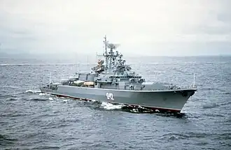 Project 1135M was an improvement on the basic Project 1135 developed in 1972 with slightly increased displacement and heavier guns.[3] They also mounted the dual-role URPK-5 Rastrub which provided secondary anti-ship capability.[4] The ships initially retained the same BPK designation as the larger vessels but were designated Guard Ship (Сторожевой Корабль, SKR) from 28 July 1977 to reflect their substantial greater anti-ship capability than the earlier members of the class and the Soviet strategy of creating protected areas for friendly submarines close to the coast.[4][5] NATO forces called the vessels 'Krivak II'-class frigates.[6] The class was also sometimes known as the Rezvyy-class after this vessel.[7]
